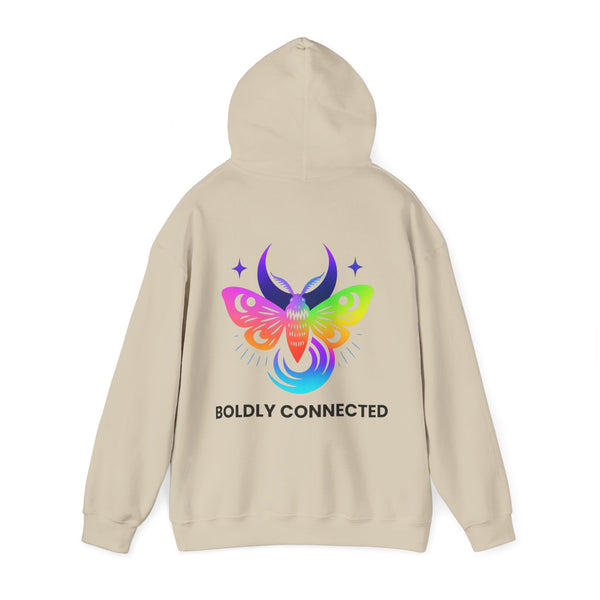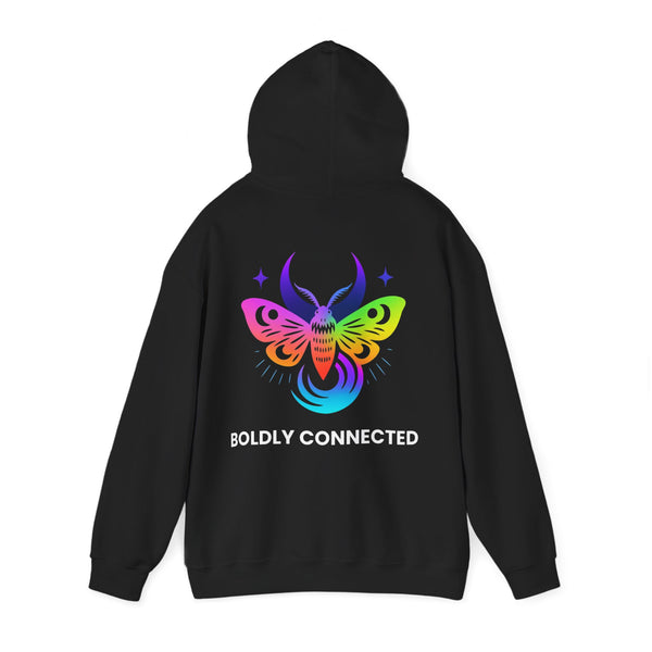 - Back print: “Boldly Connected” with radiant moth artwork