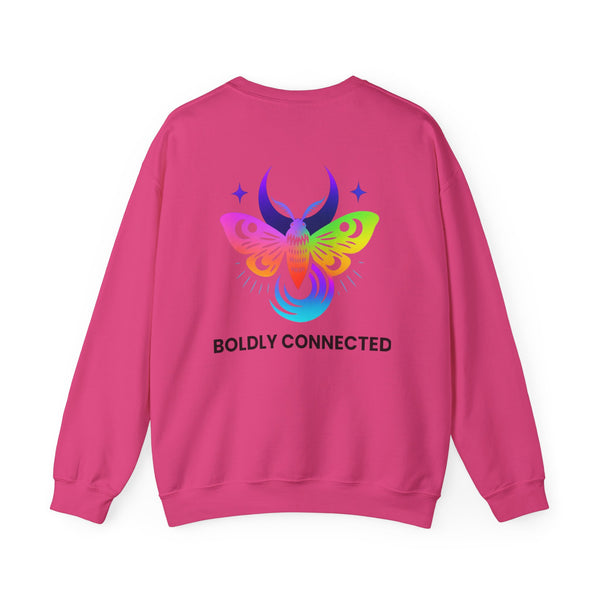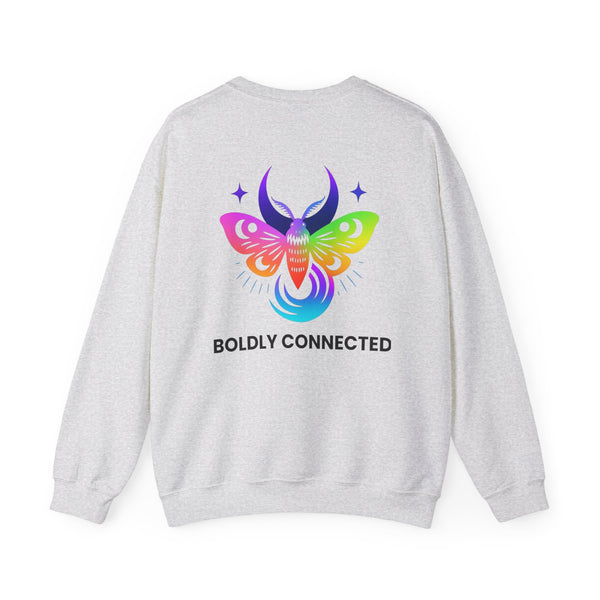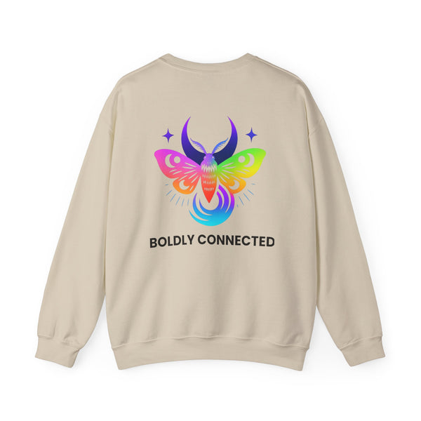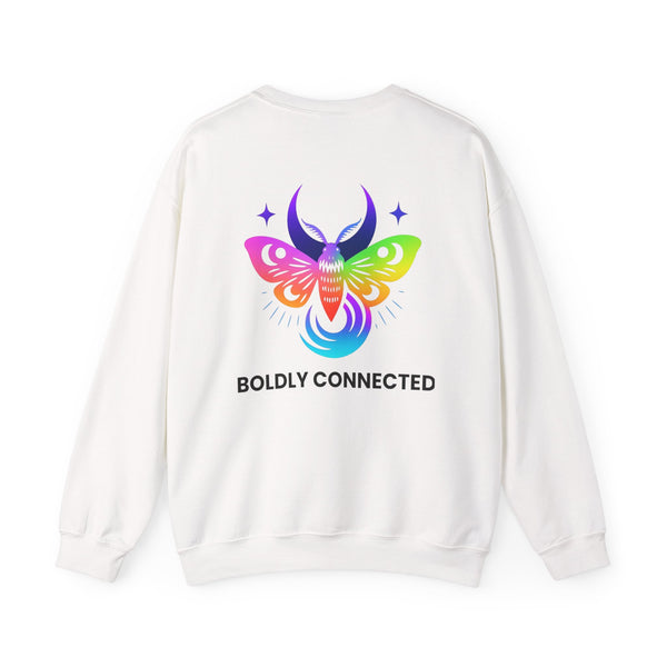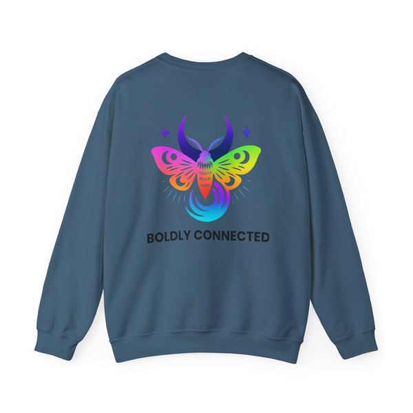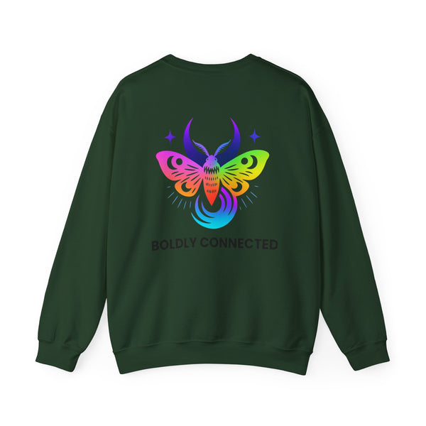 - Back print: “Boldly Connected” with radiant moth artwork