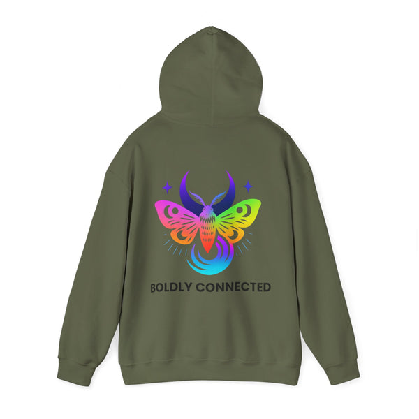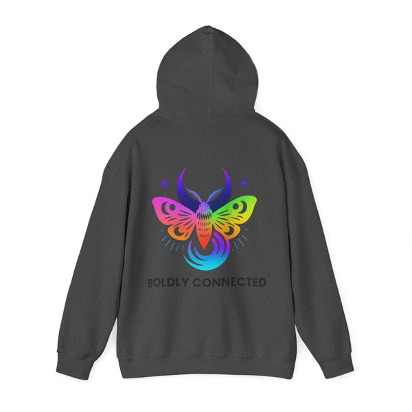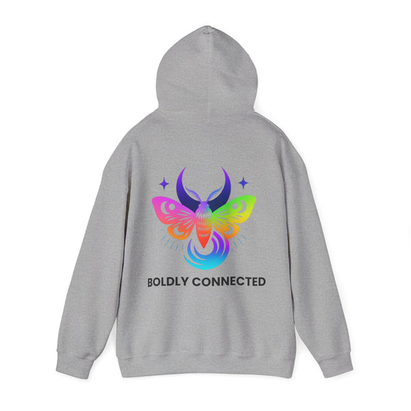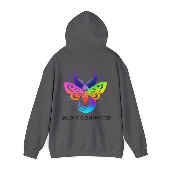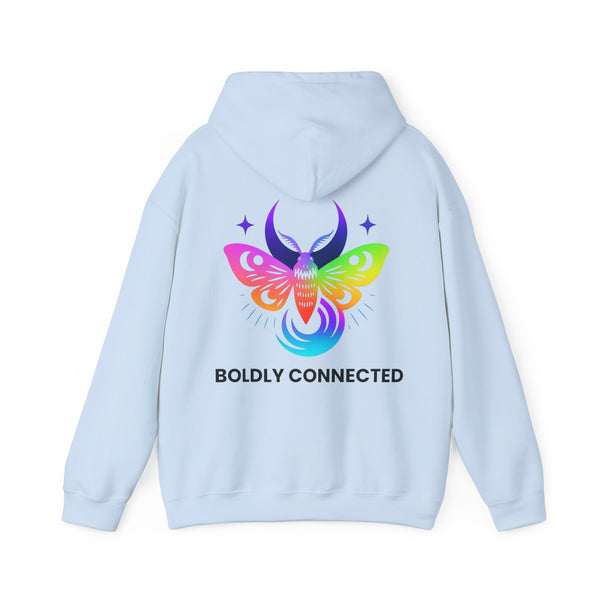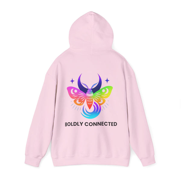 - Back print: “Boldly Connected” with radiant moth artwork