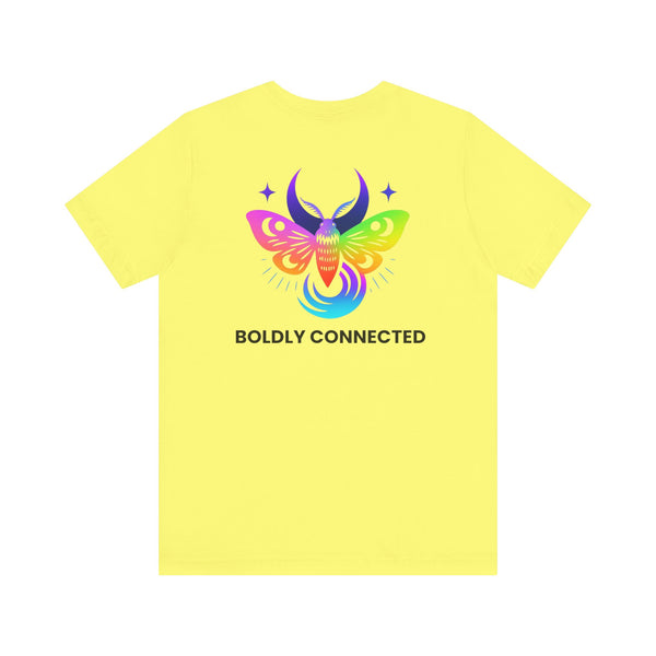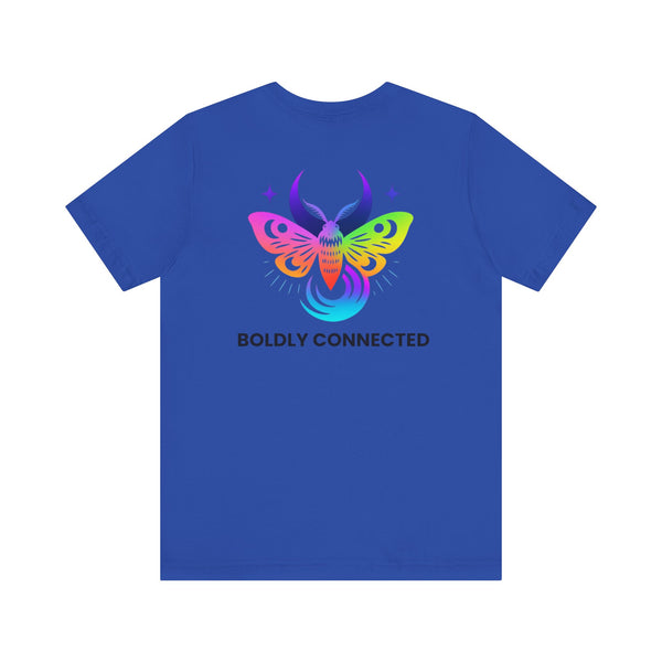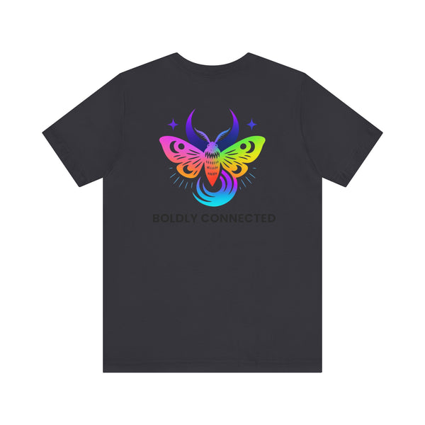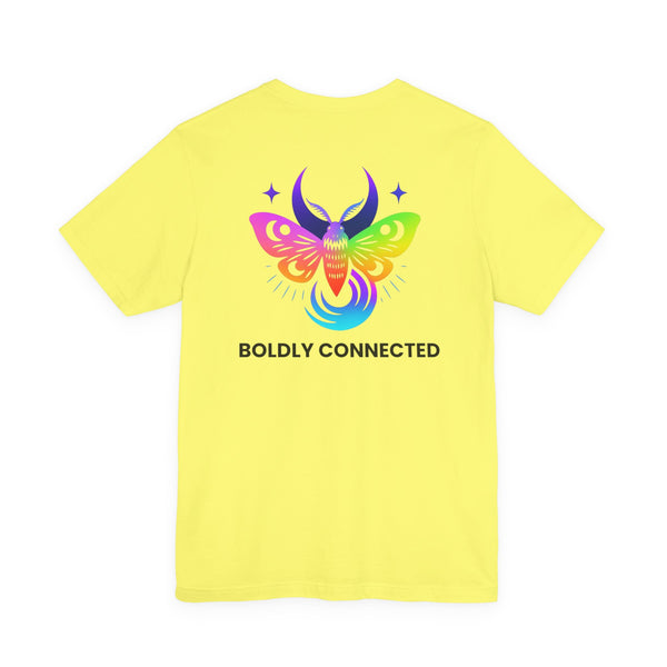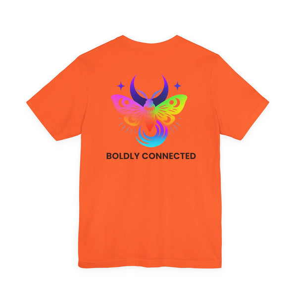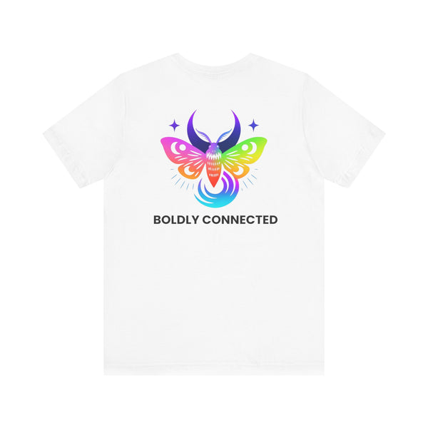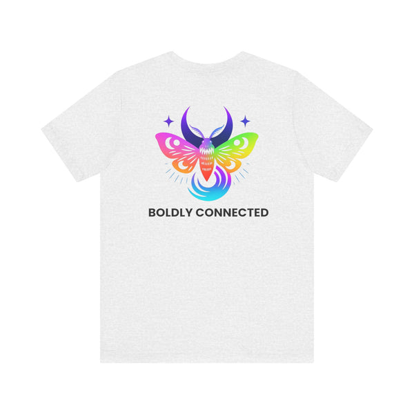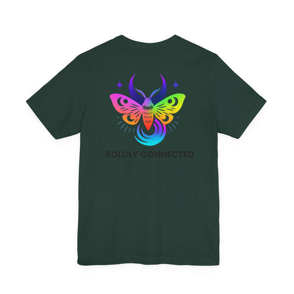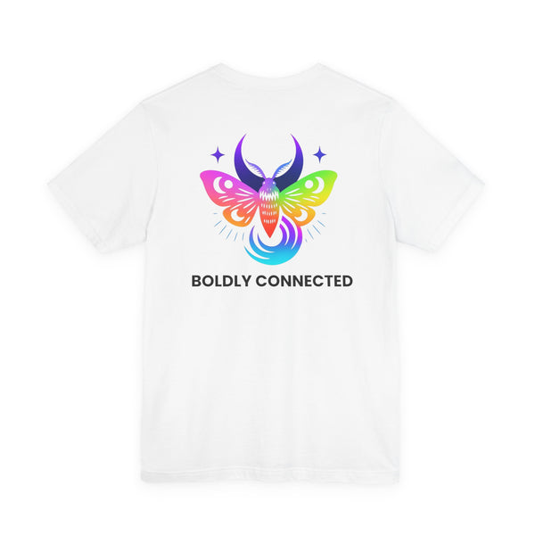 - Back print: “Boldly Connected” with radiant moth artwork