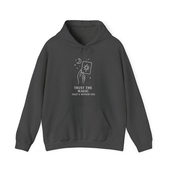 The Trust the Magic Hoodie features elegant celestial art: open hands, butterflies, swirling stars, and soft sparkles - all designed to reflect transformation and inner magic.